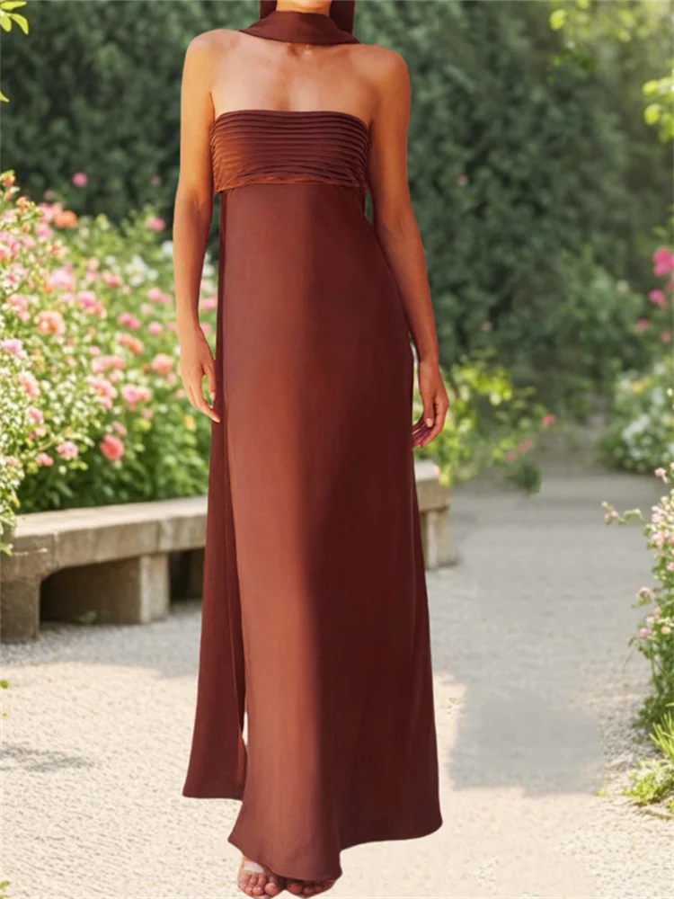 Women’s Long Satin Tube Dress Solid Color Low Cut Strapless Pleated Design Slim Dress